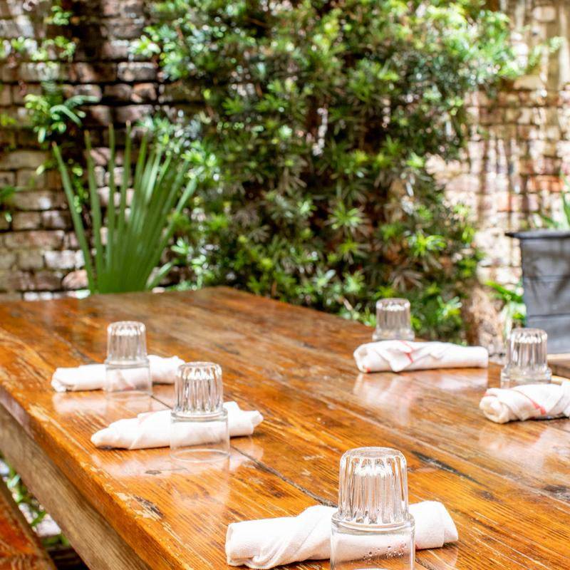 On the back deck we created bar height tables and benches made out of out door reclaimed dock wood. Farm Table with stretcher base.