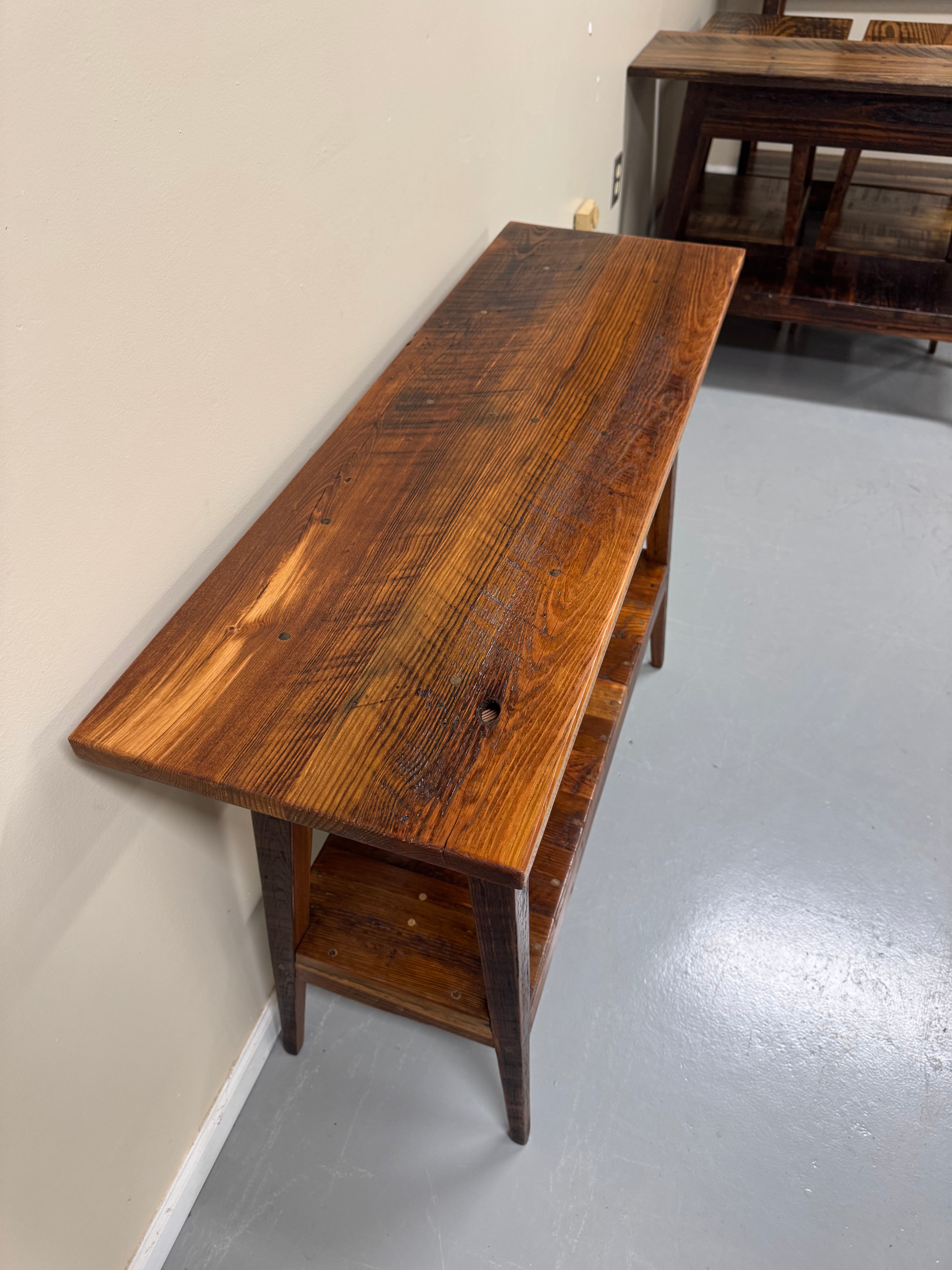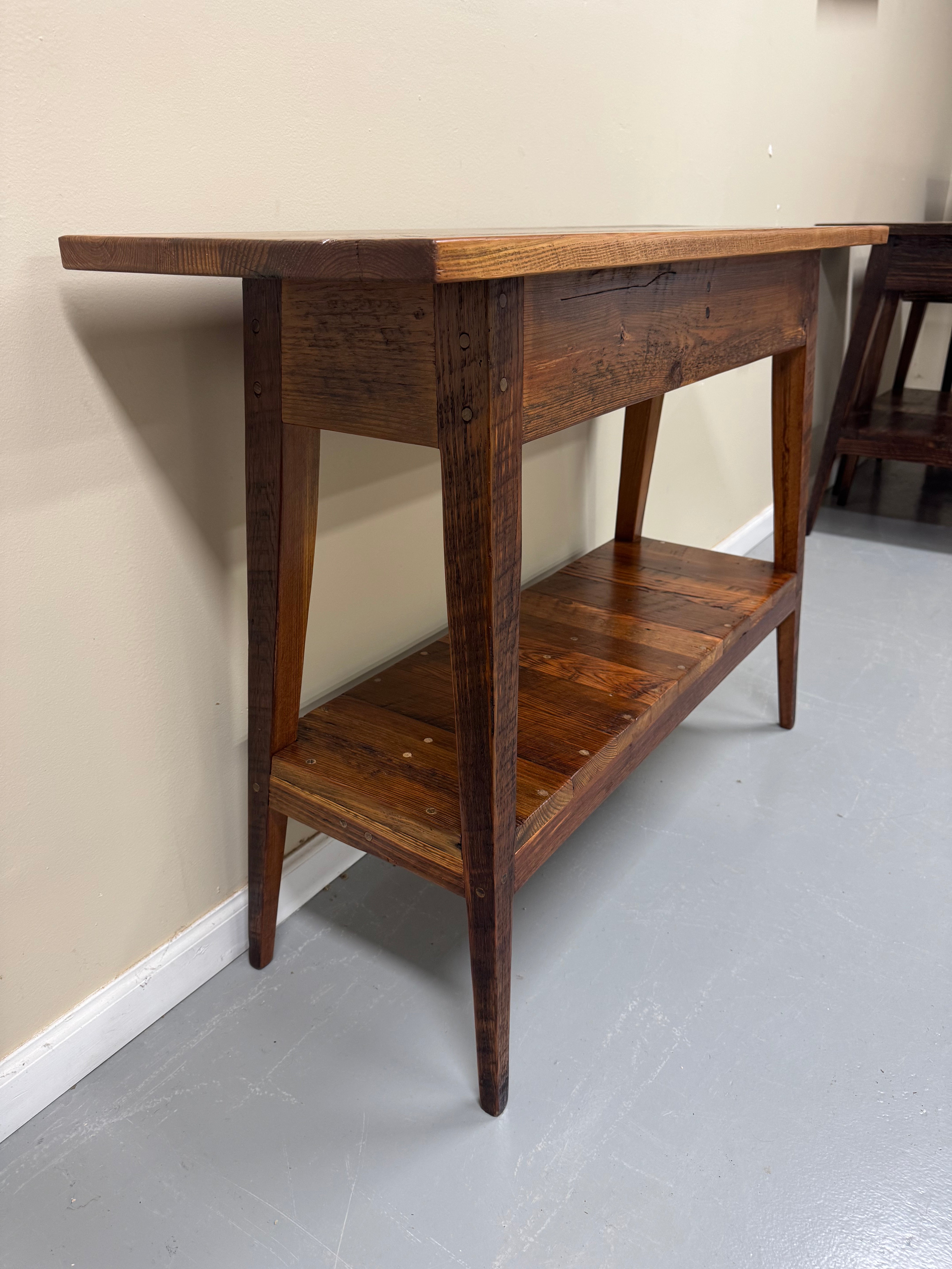 Console table made with 100% local antique heart pine from a renovated home in Walterboro, SC circa 1840. Table has Low shelf. Rustic Texture and natural color hue