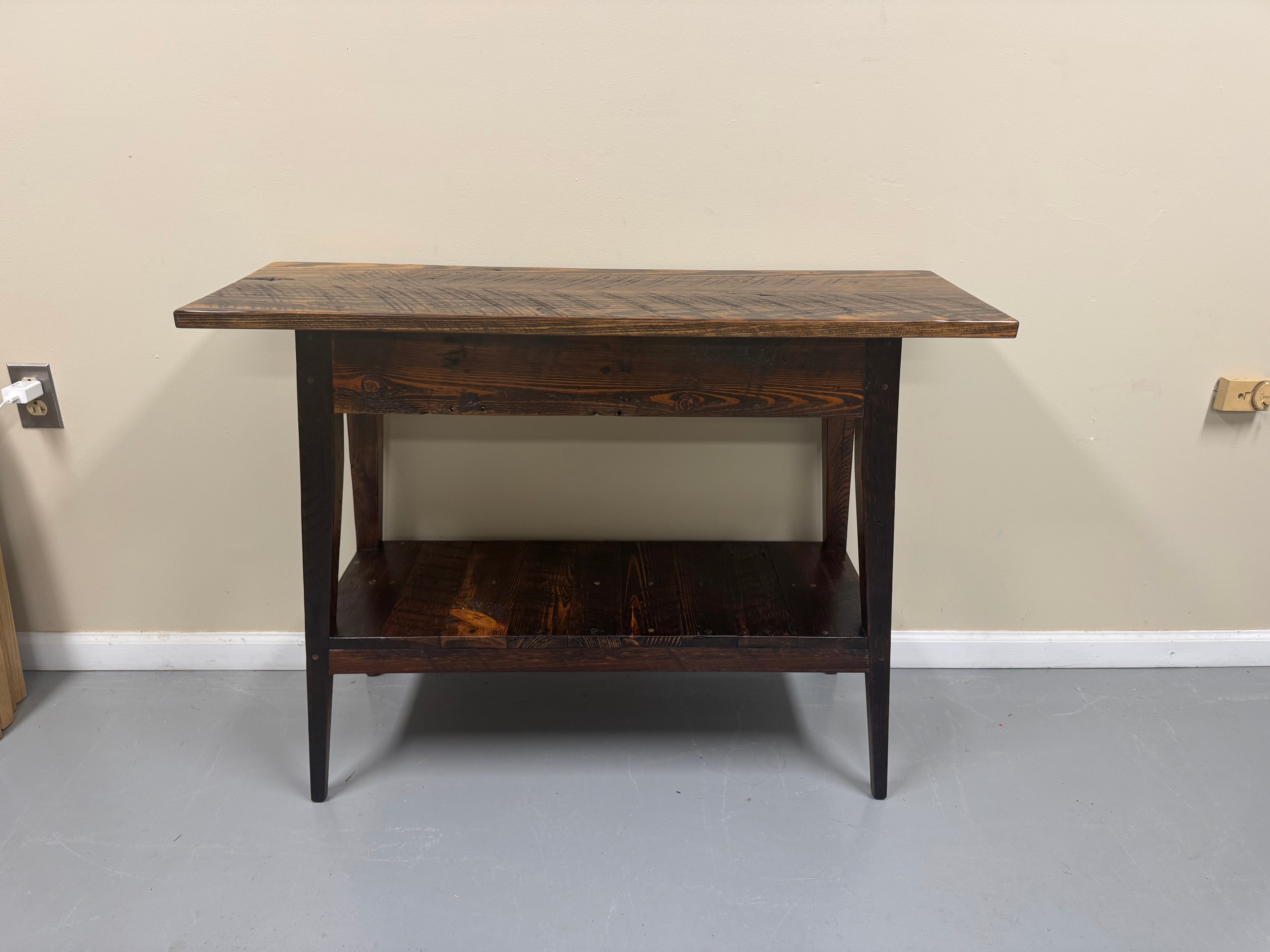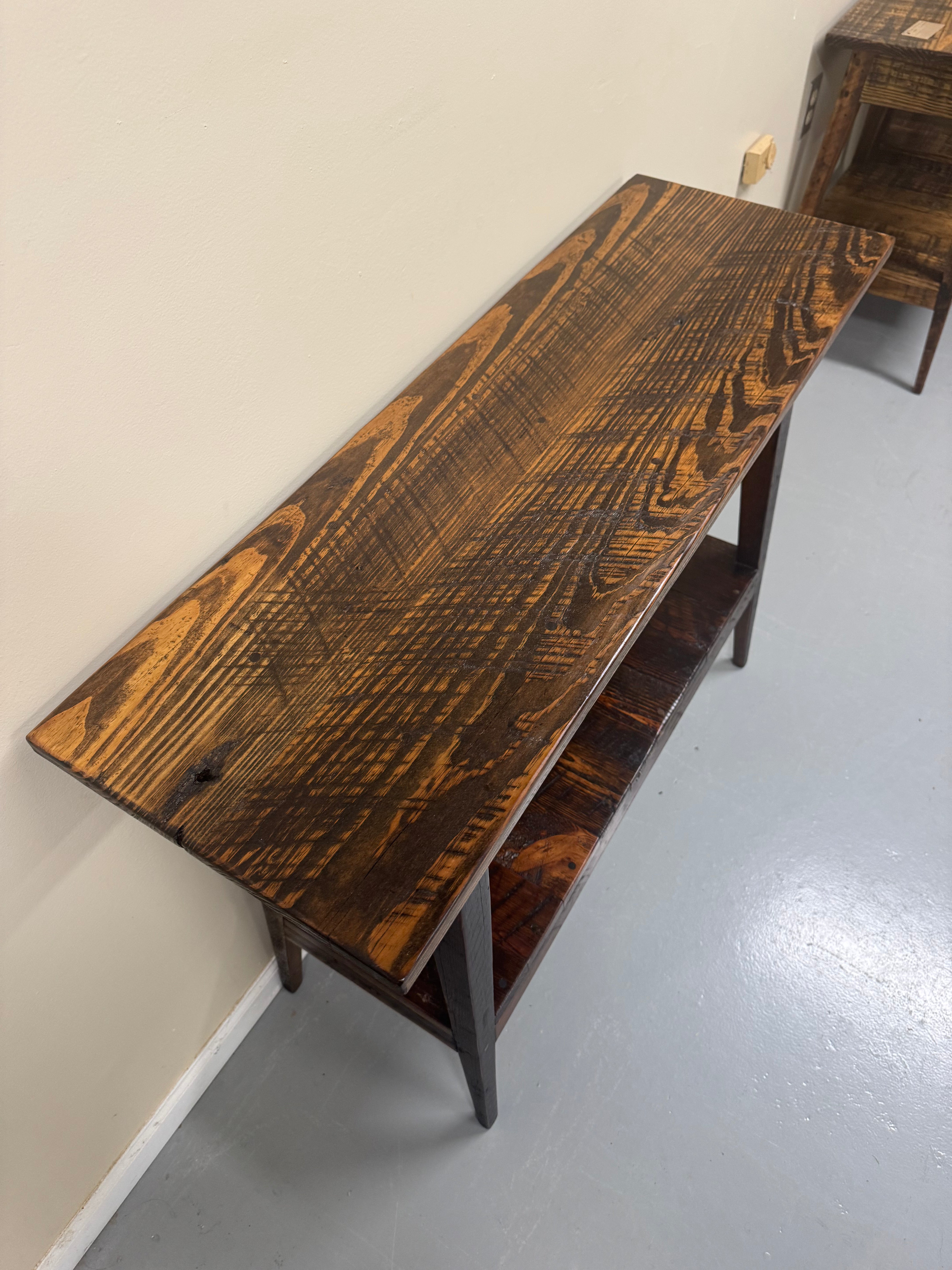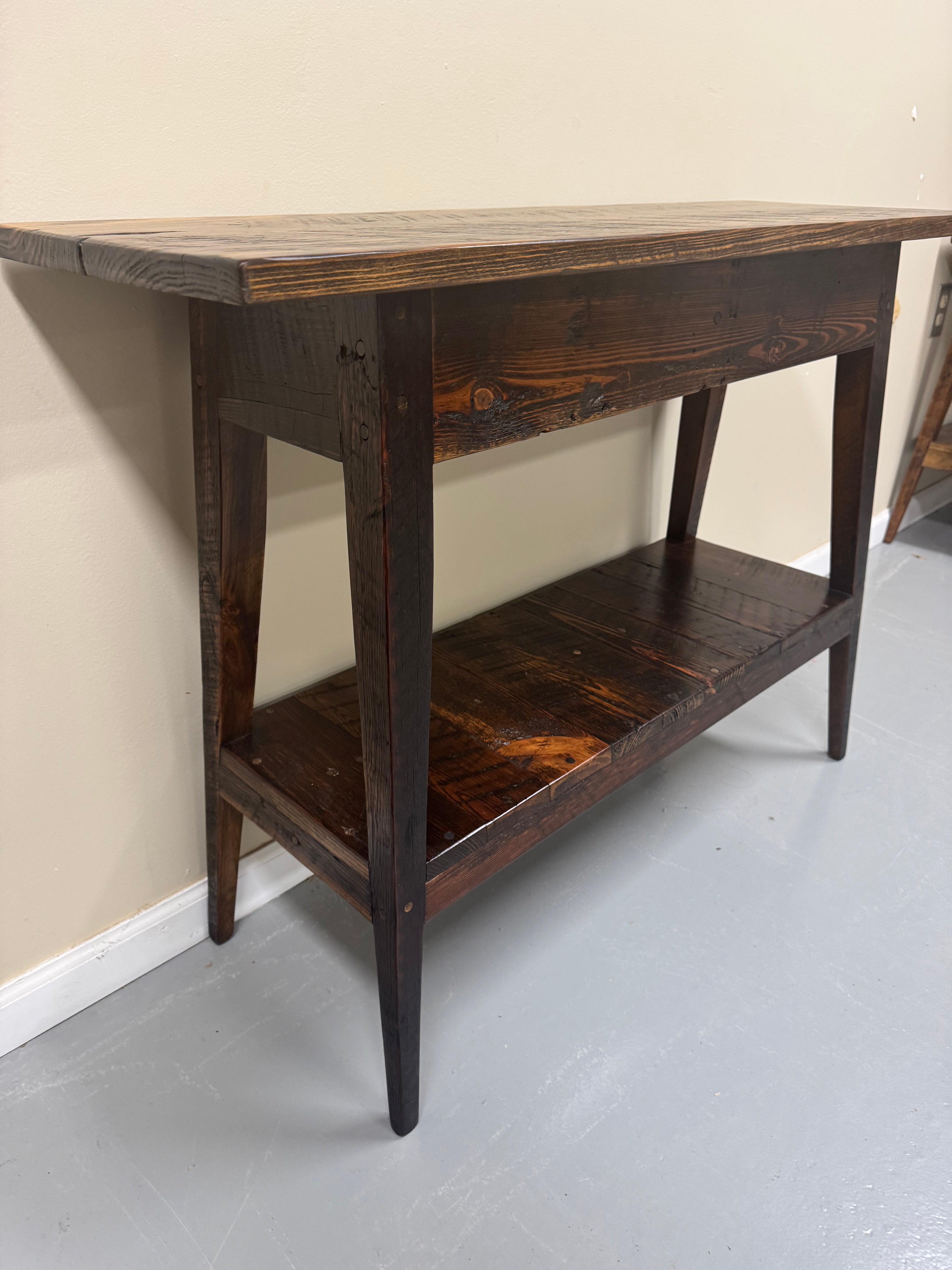 Console table made with 100% local antique heart pine from a renovated home in Walterboro, SC circa 1840. Table has Low shelf. Rustic Texture and darker color hue
