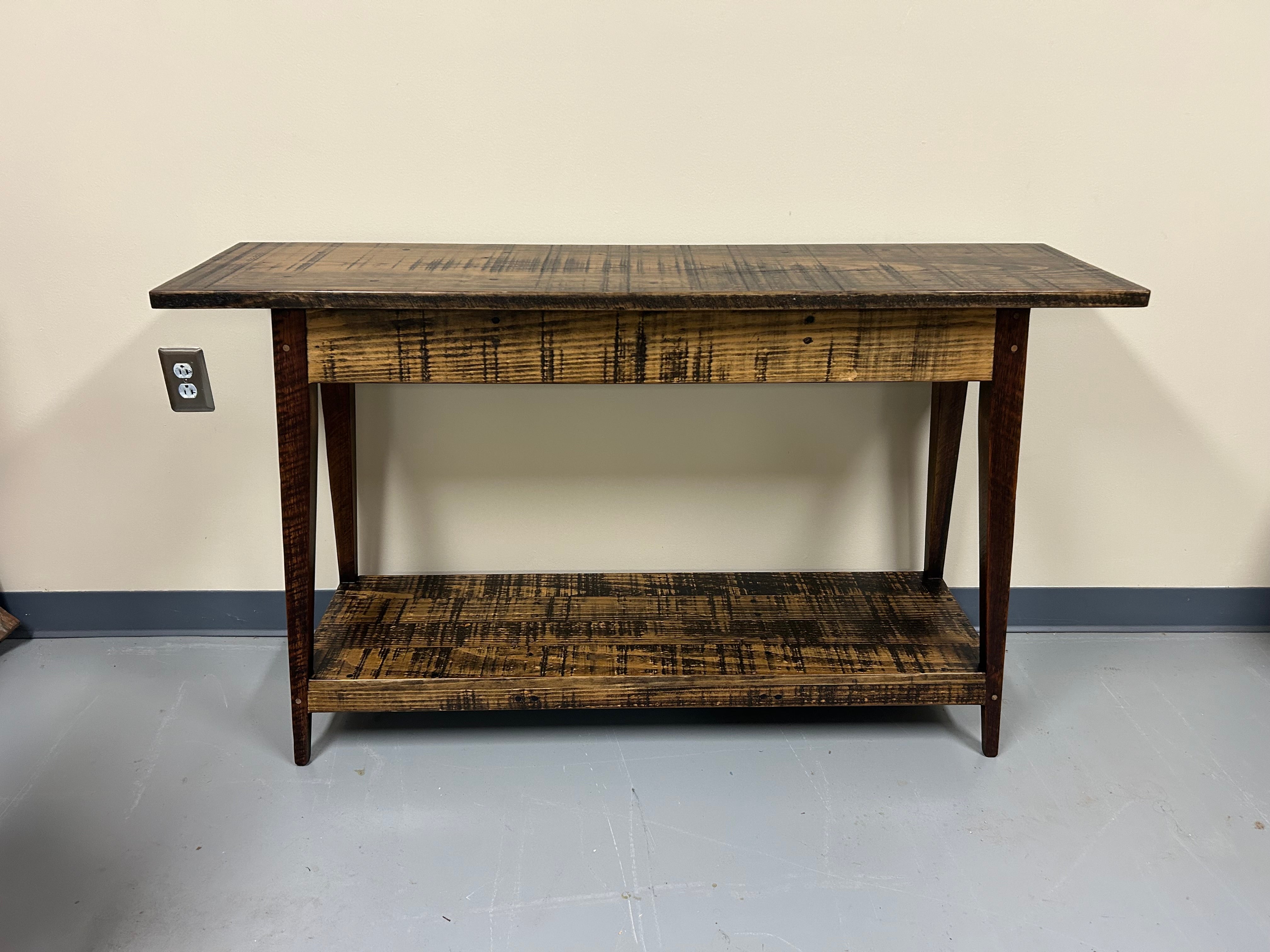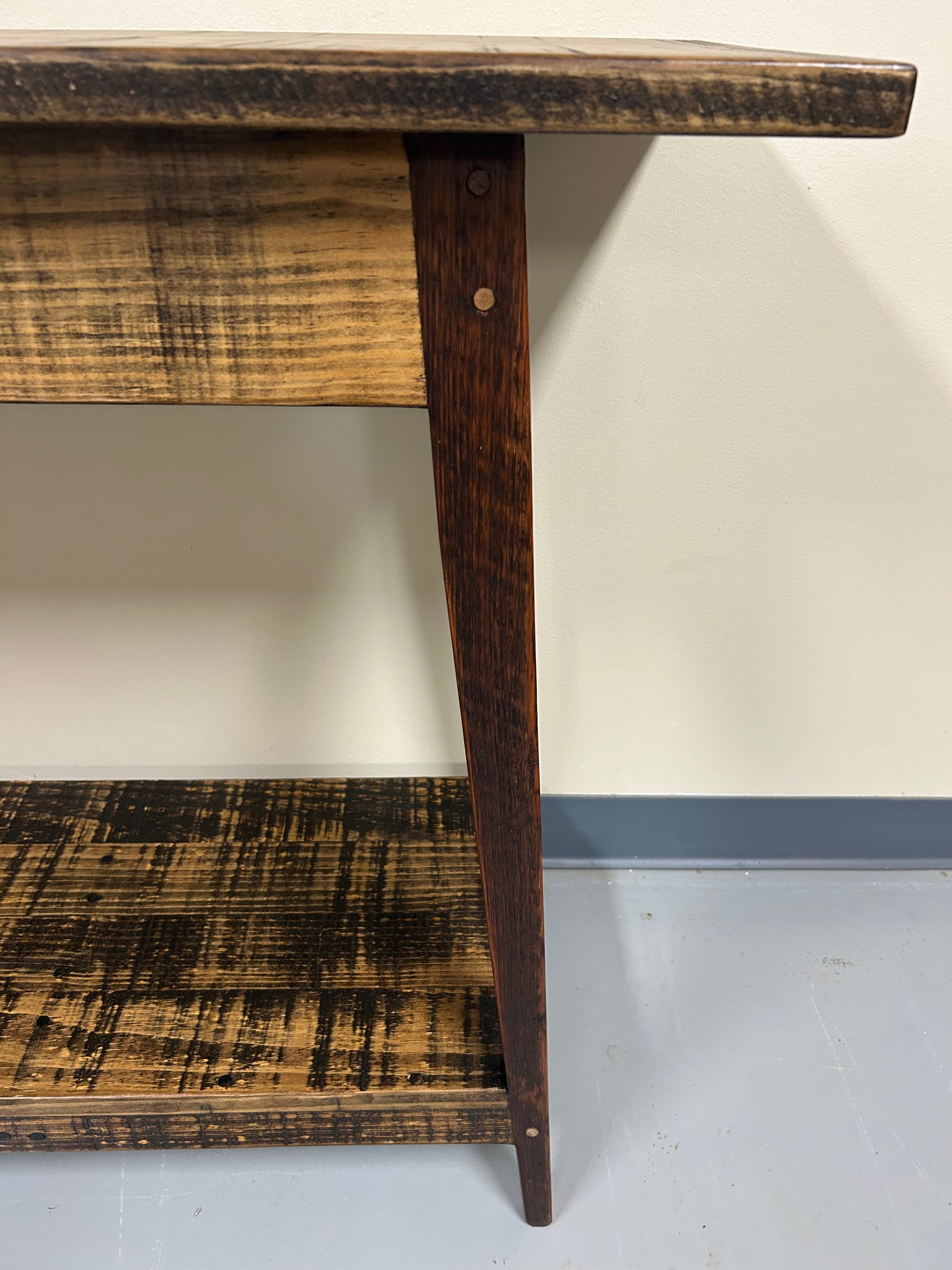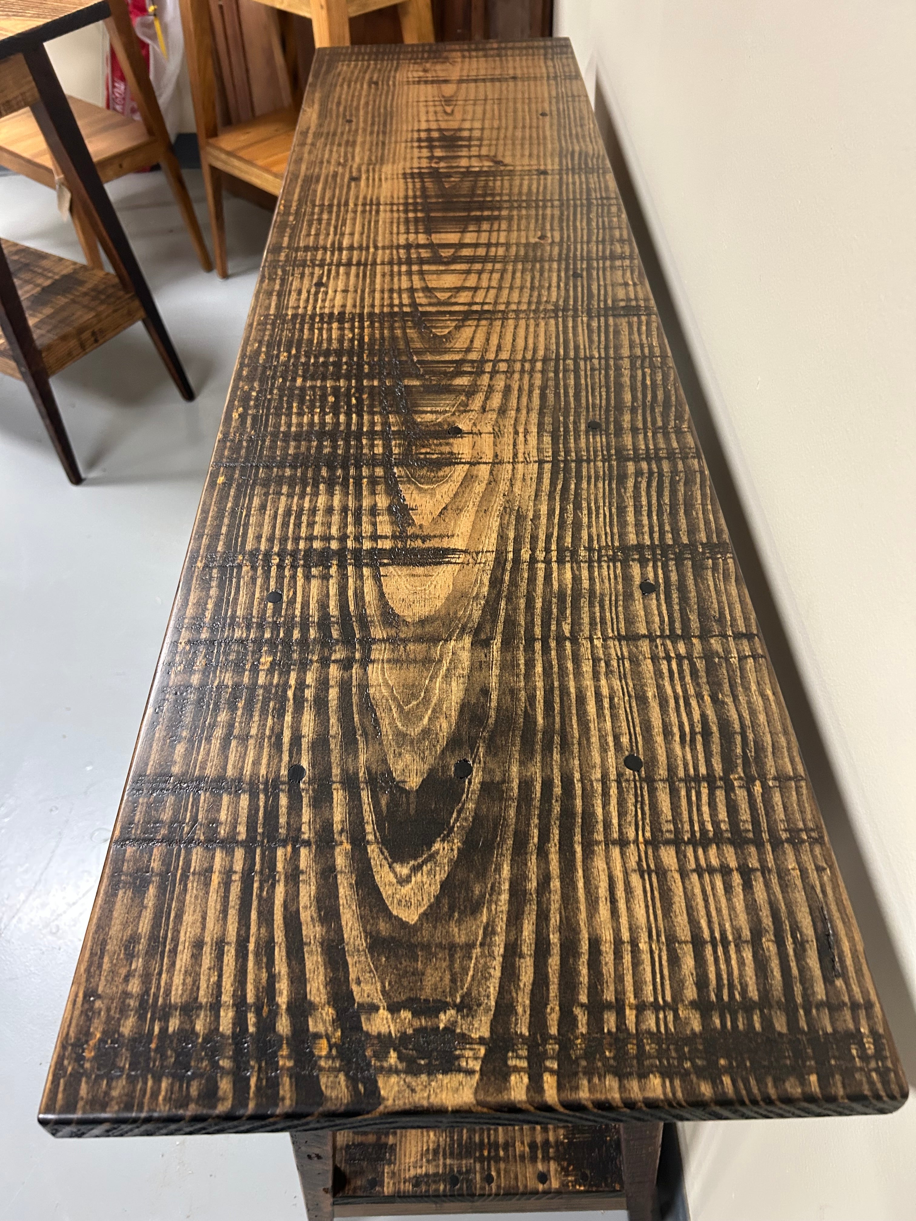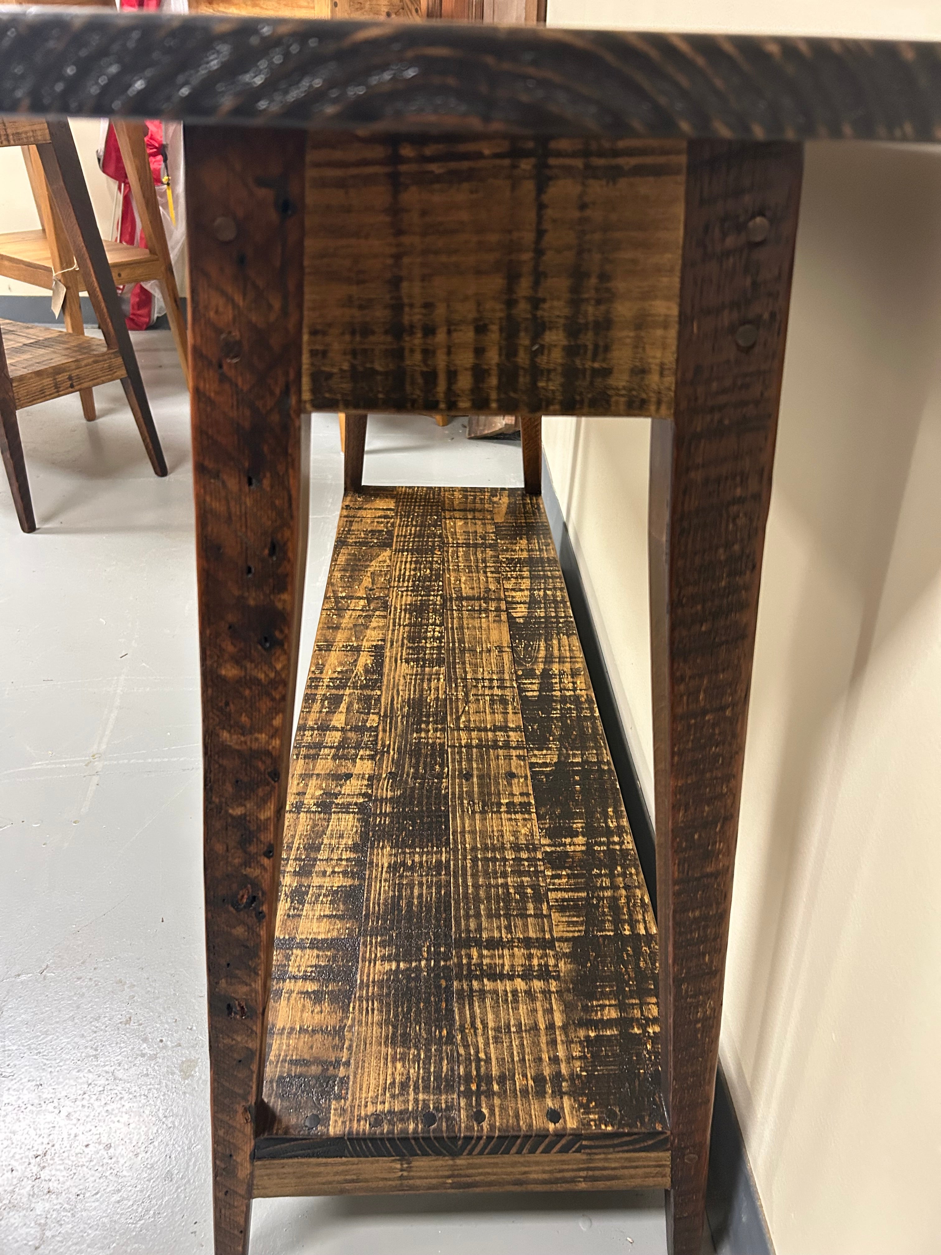 Console table with yellow pine and antique heart pine. Original saw marks and character with low shelf. Darker stain