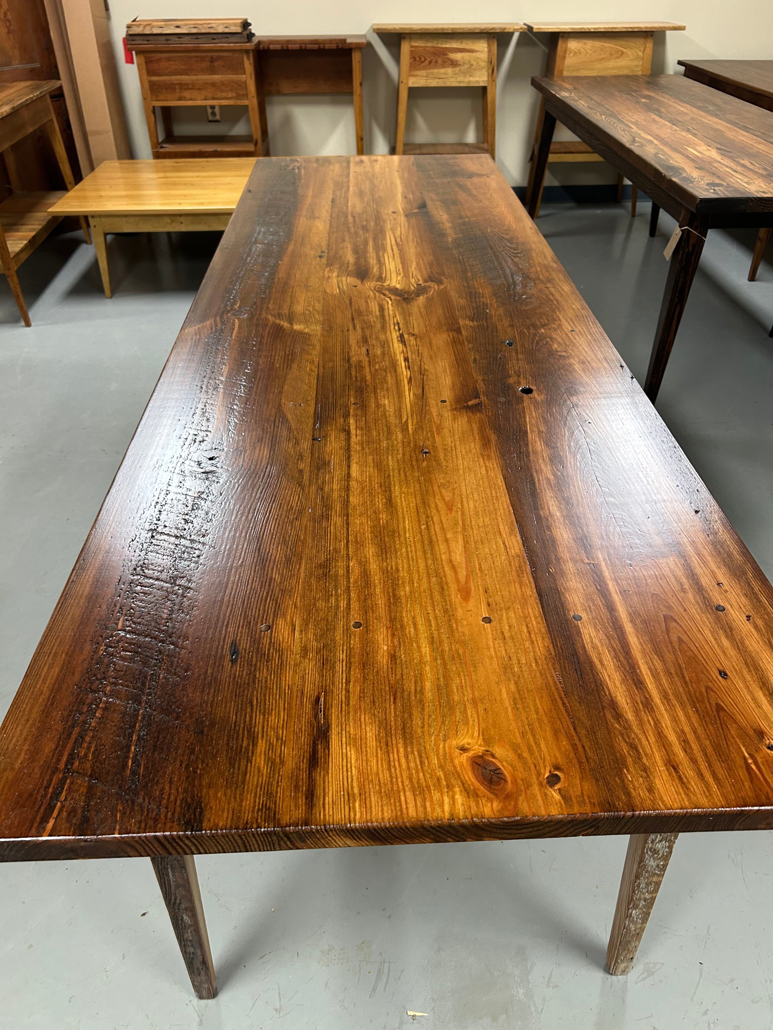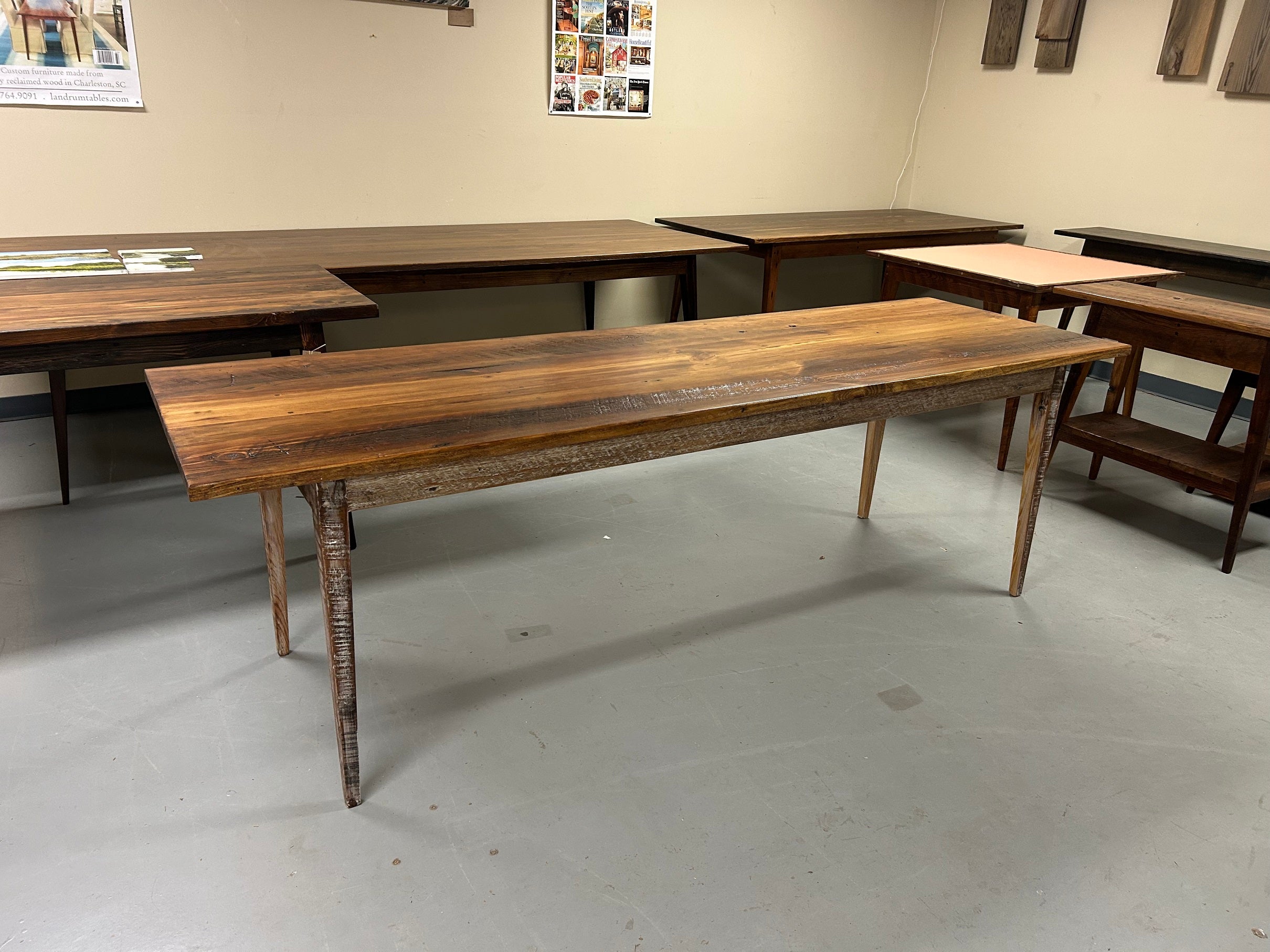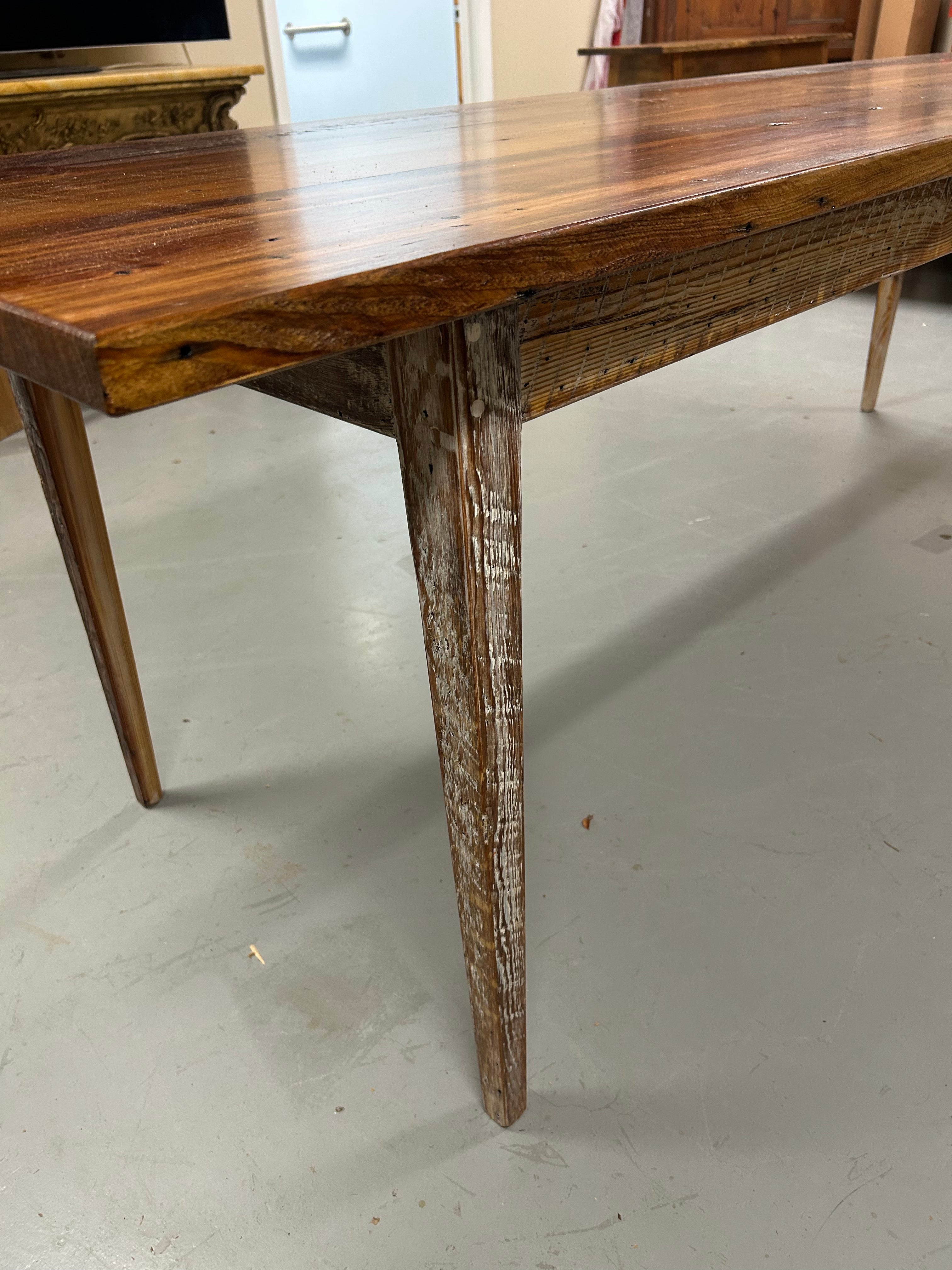 Signature Farm table, narrow. Perfect for back porch or thin dining room. Made from 100% antique heart pine from Walterboro, SC circa 1840's. White wash finish on base.