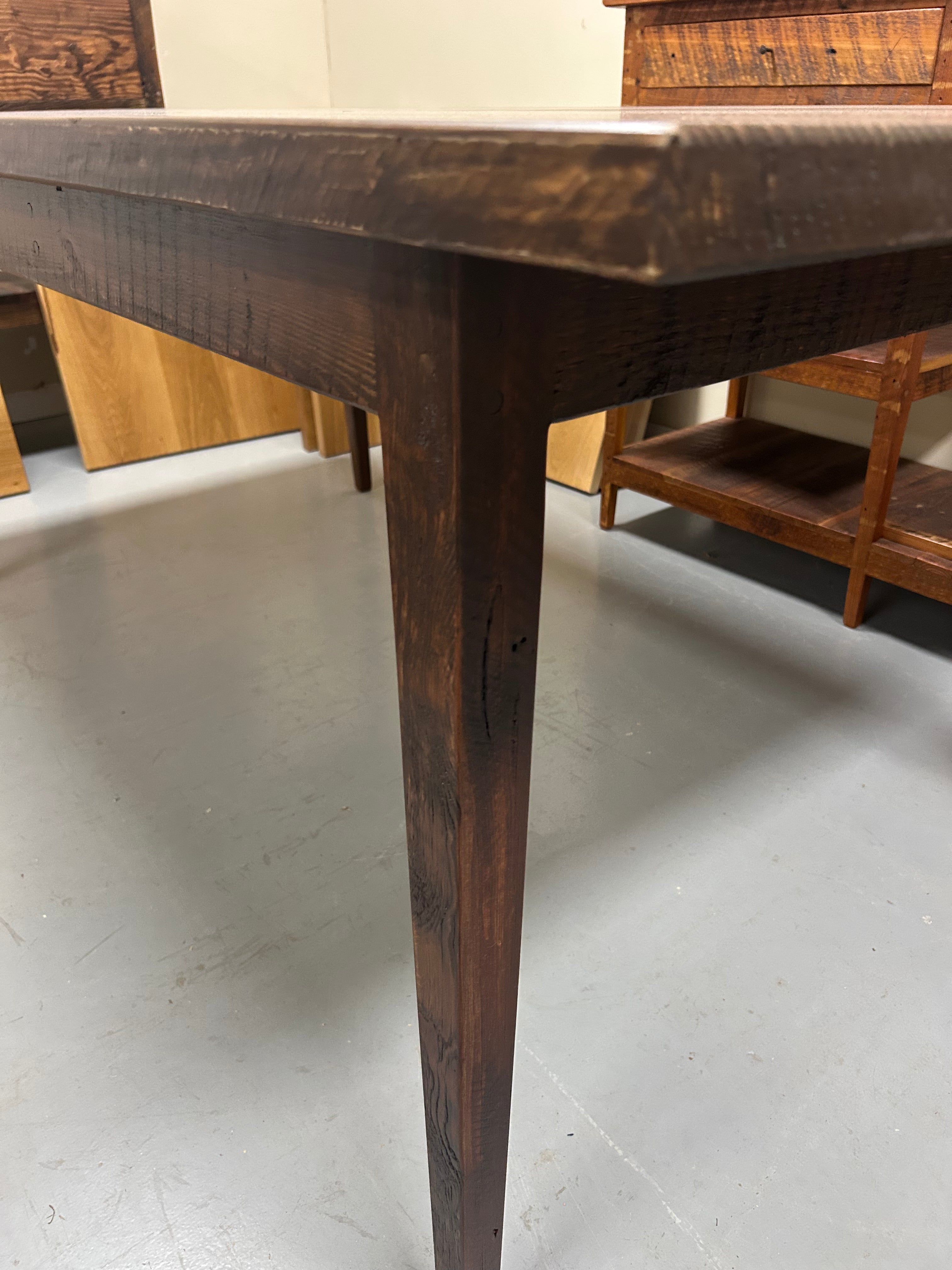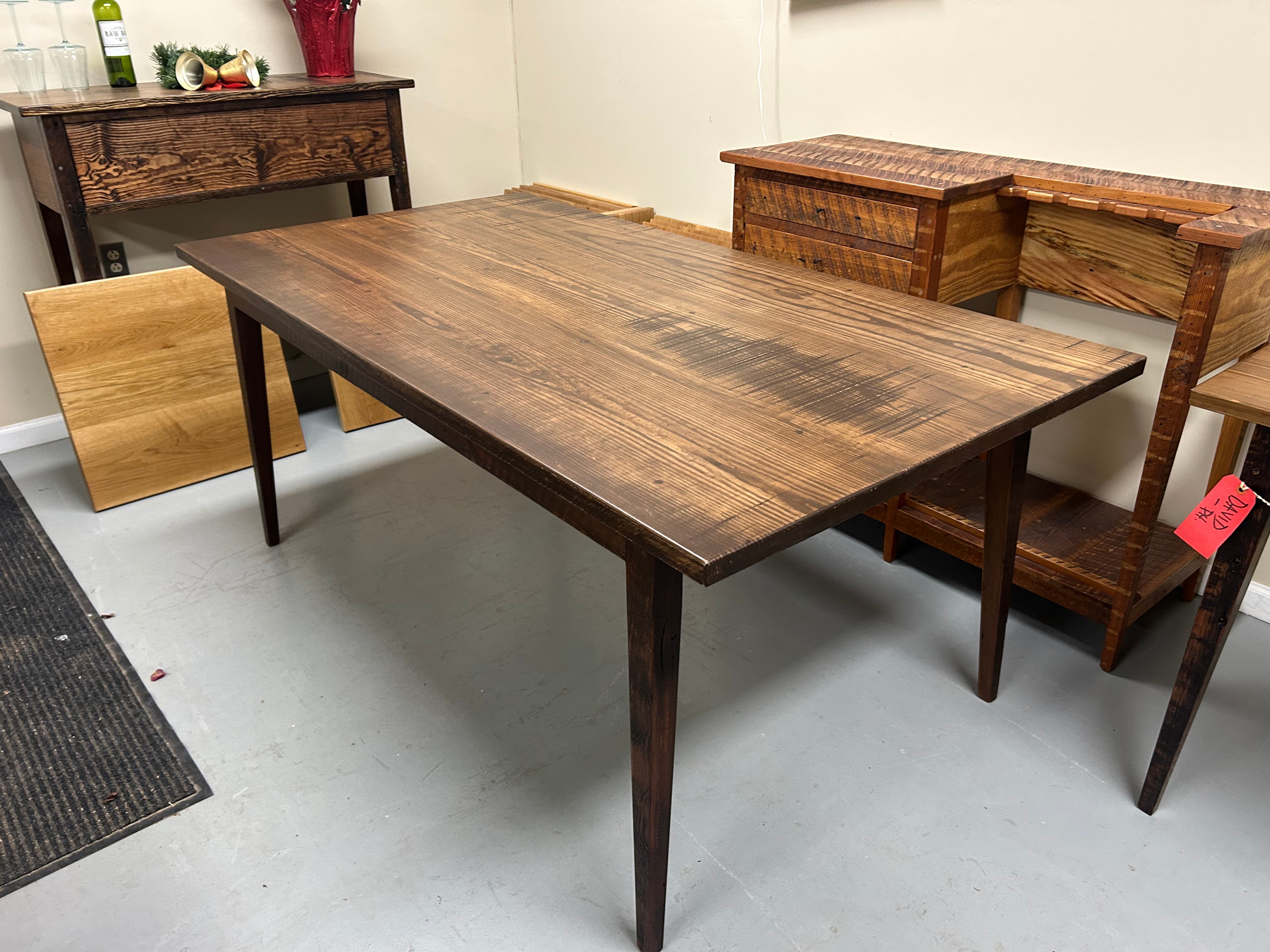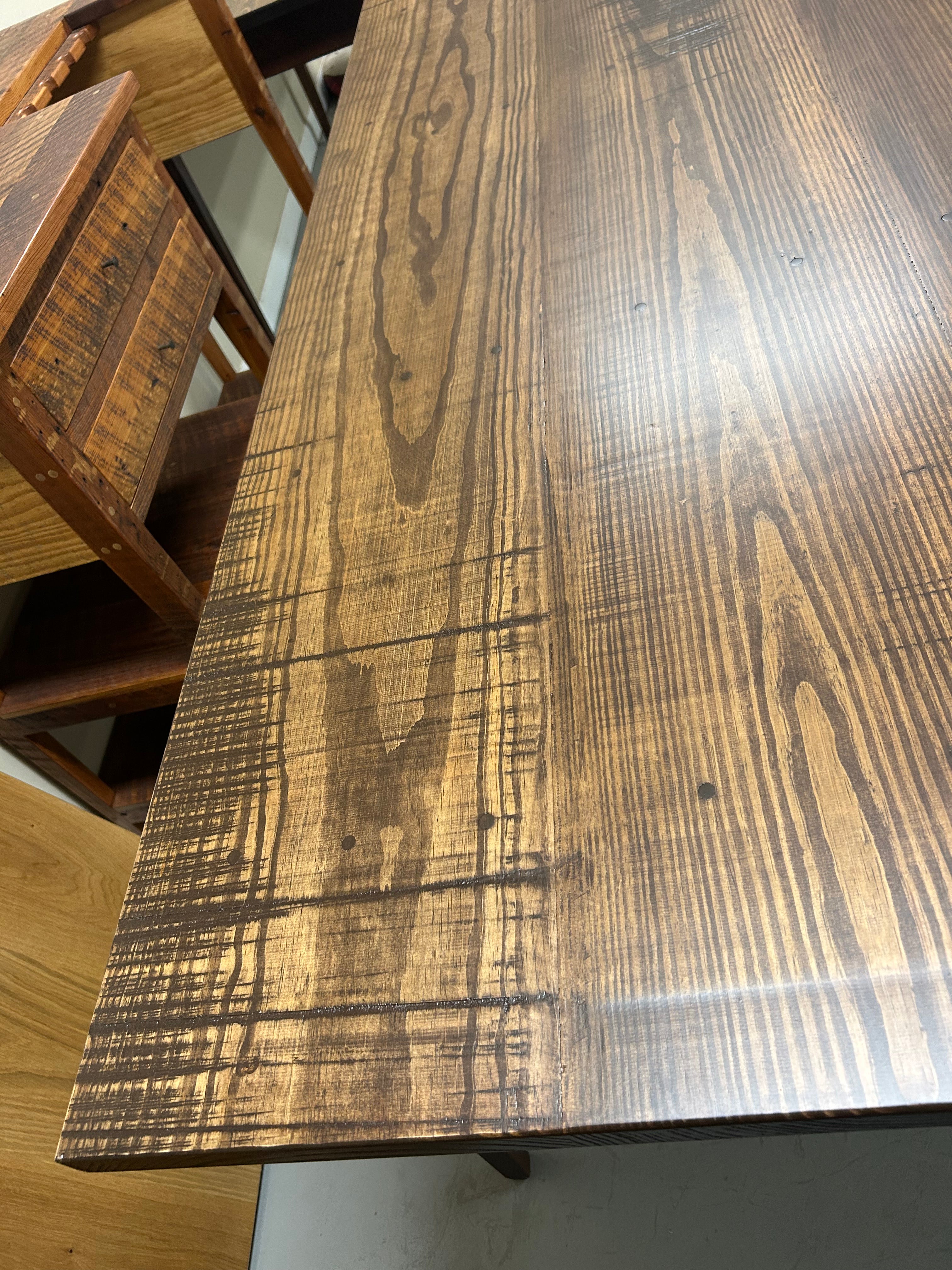 Signature Farm Table made with local wide yellow pine wood boards from Marion, SC. Original band saw marks on table