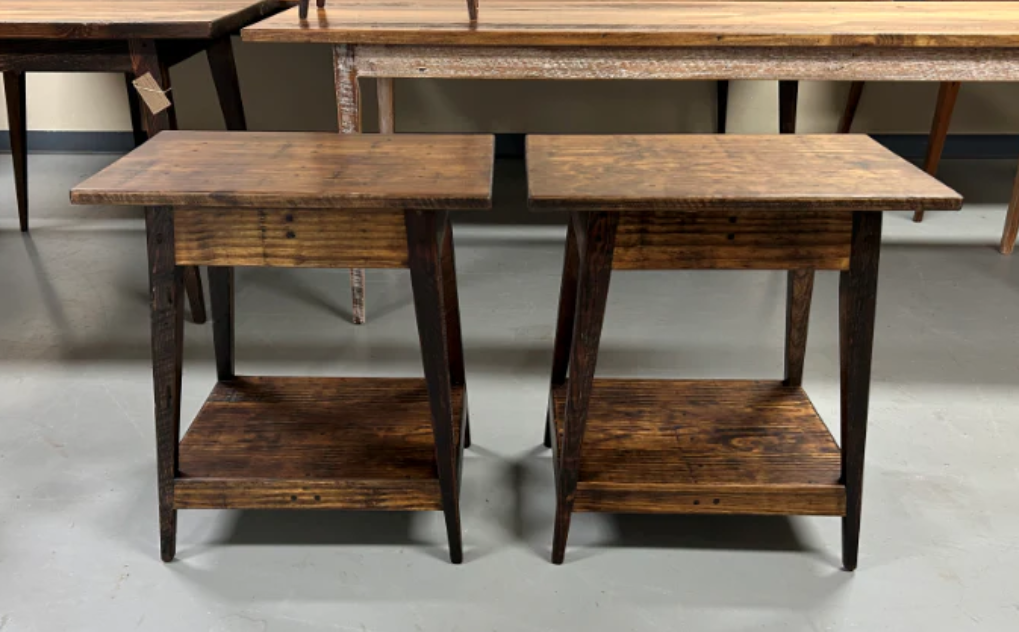 Side Tables - Pair, made with local yellow pine and antique heart pine - mid/low level shelf. Darker stain color