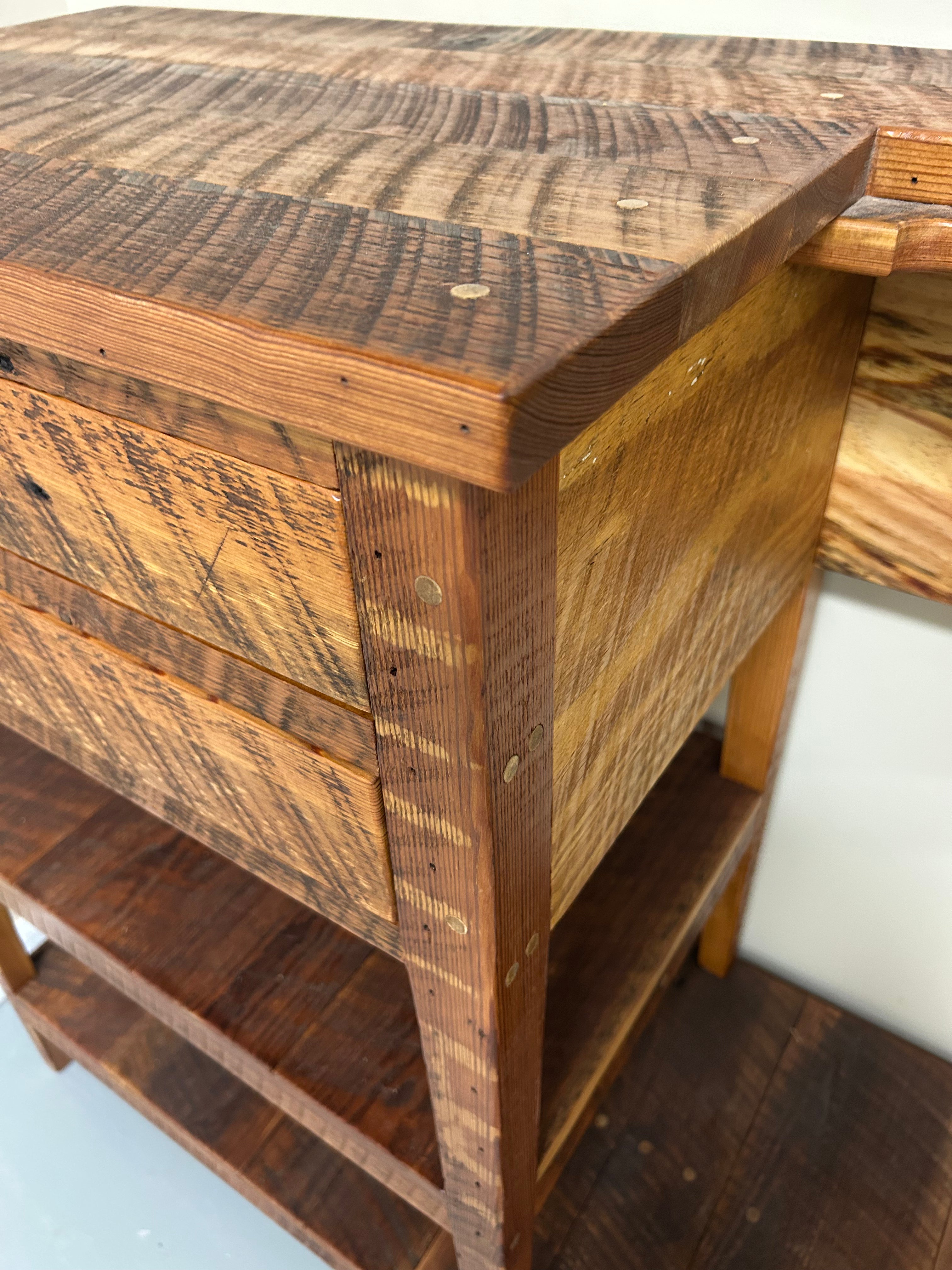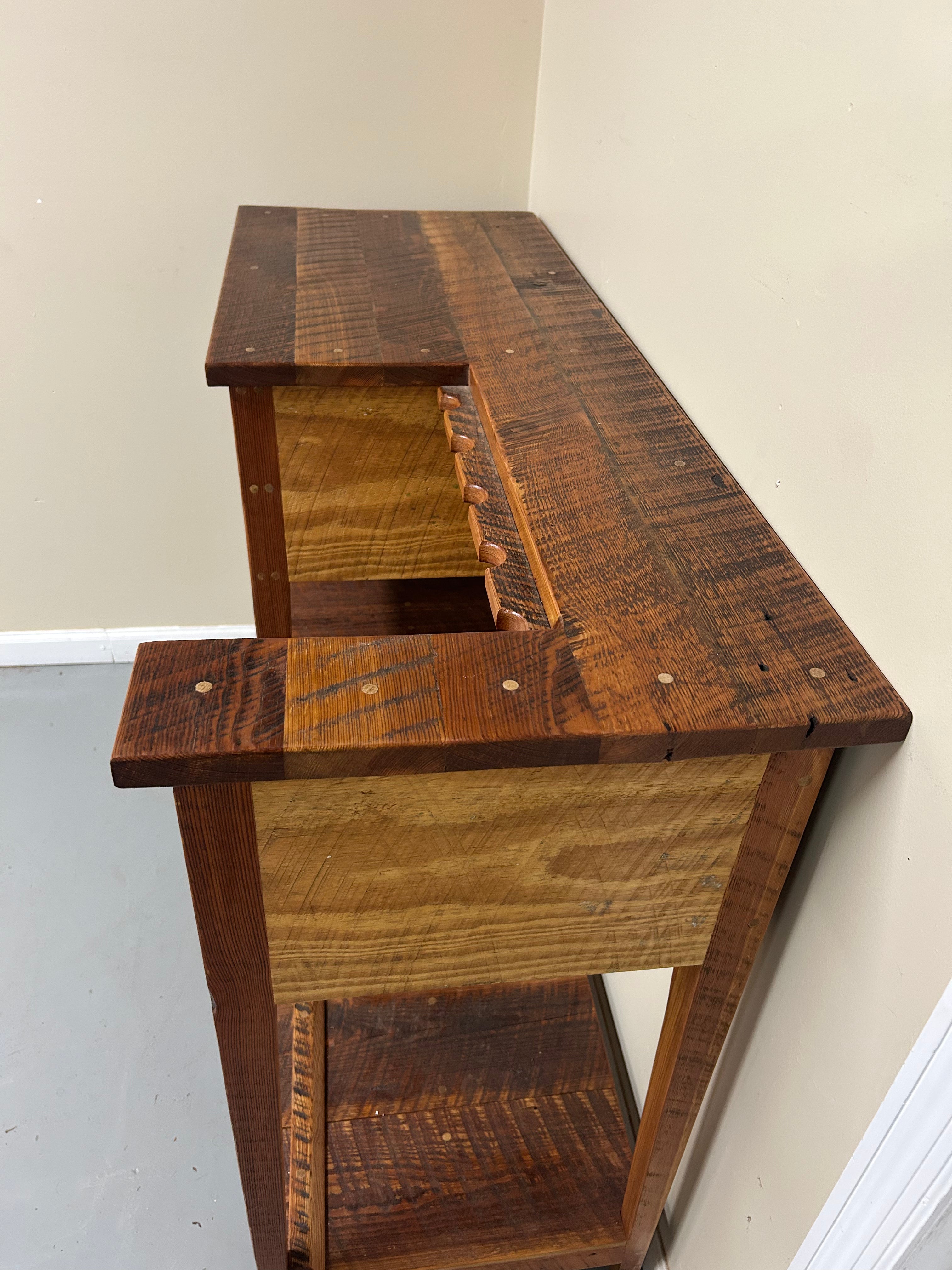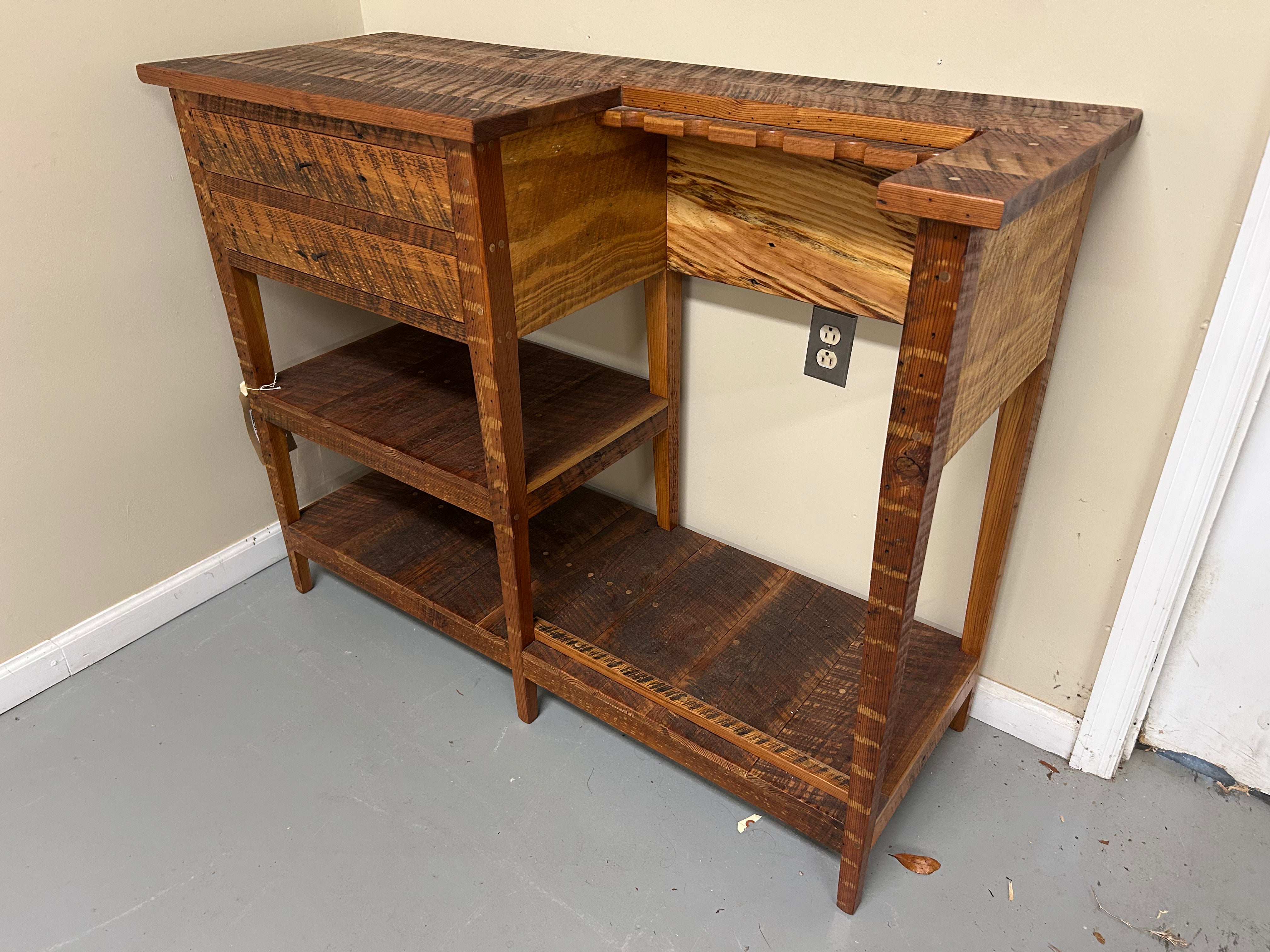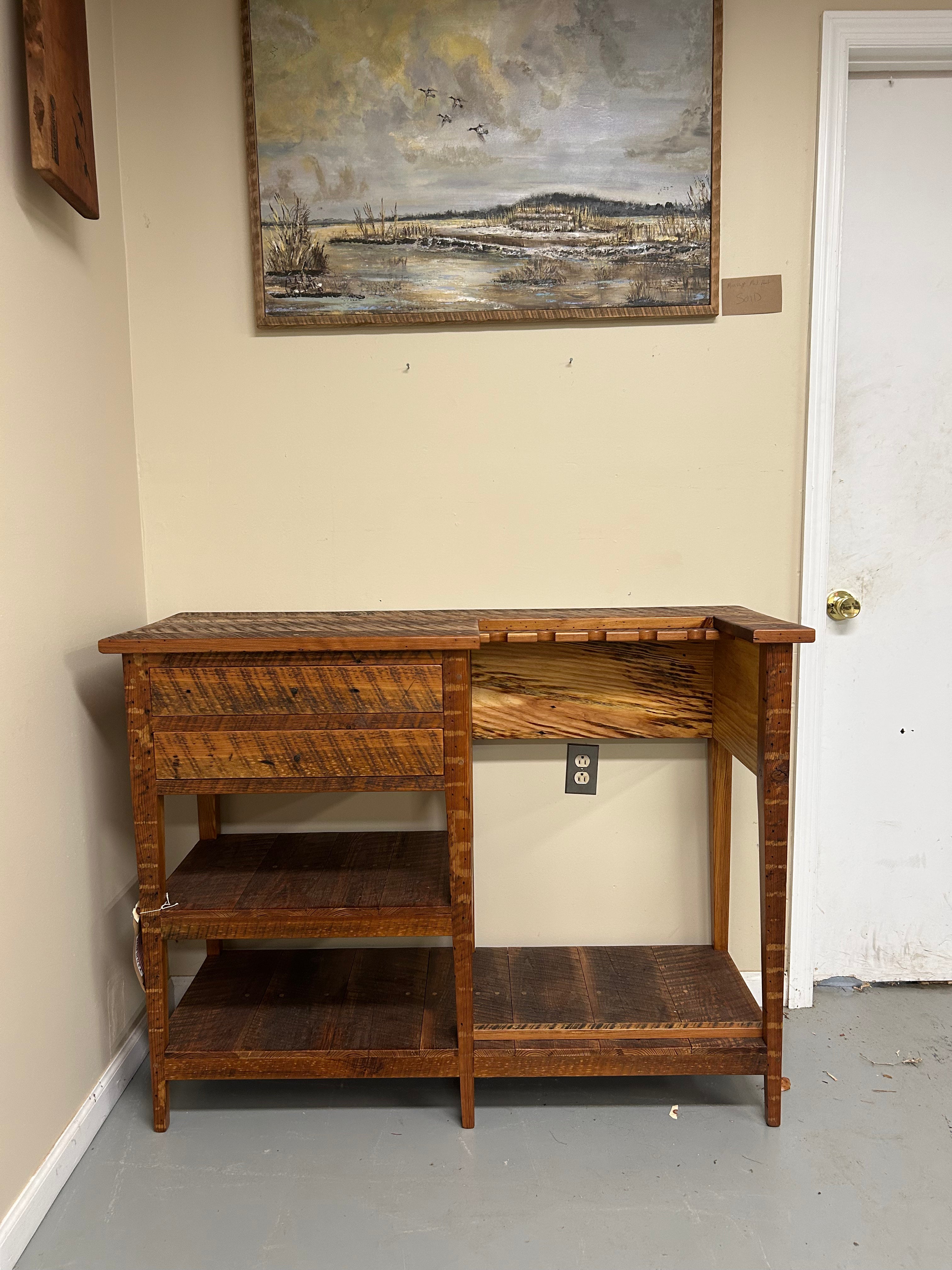 Fly Rod/Gun Rack with mid and low shelf made in 100% local heart pine wood. Two drawers with old forged iron nails as drawer pulls (added on after image taken).