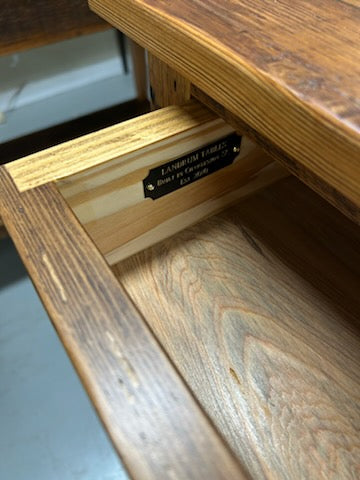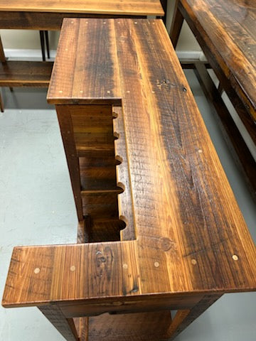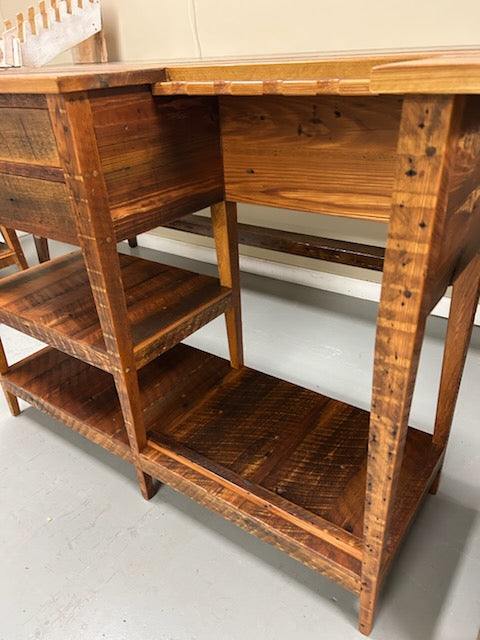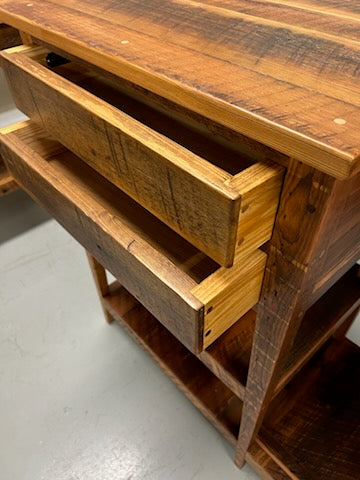 Fly Rod/Gun Rack with mid and low shelf made in 100% local heart pine wood. Two drawers and two shelves. Holds 5 guns or fishing rods. Rustic heart pine with original saw marks and nail pulls. Wood from an old 1840's home in Walterboro, SC