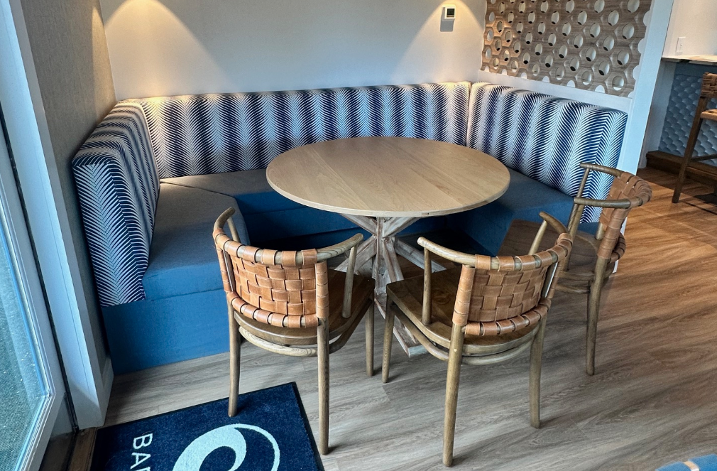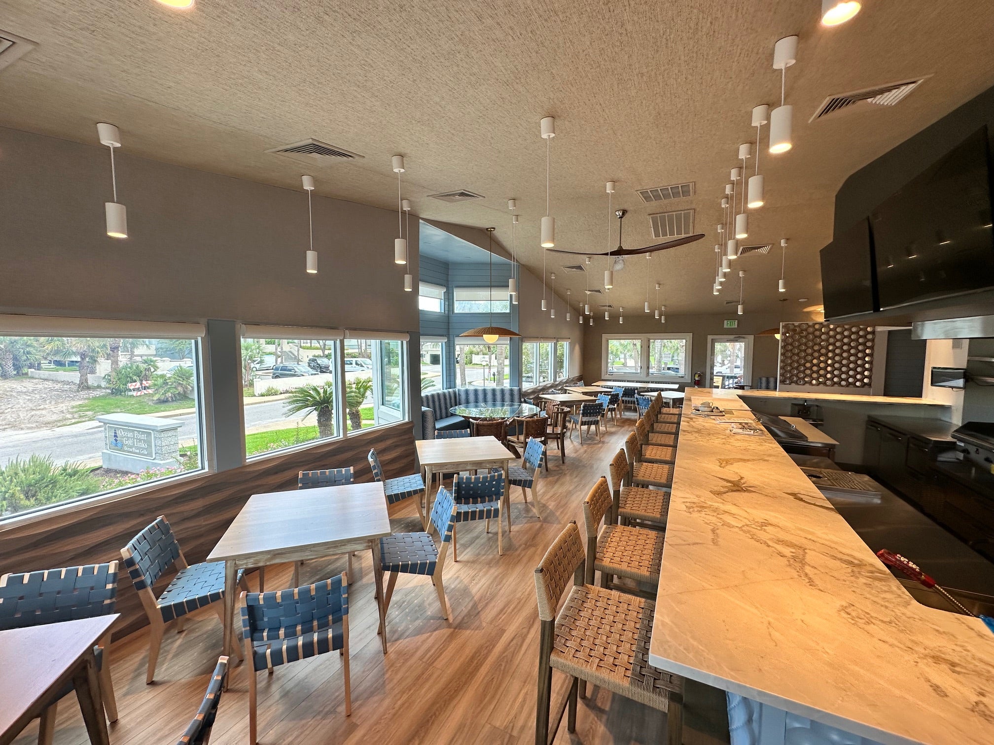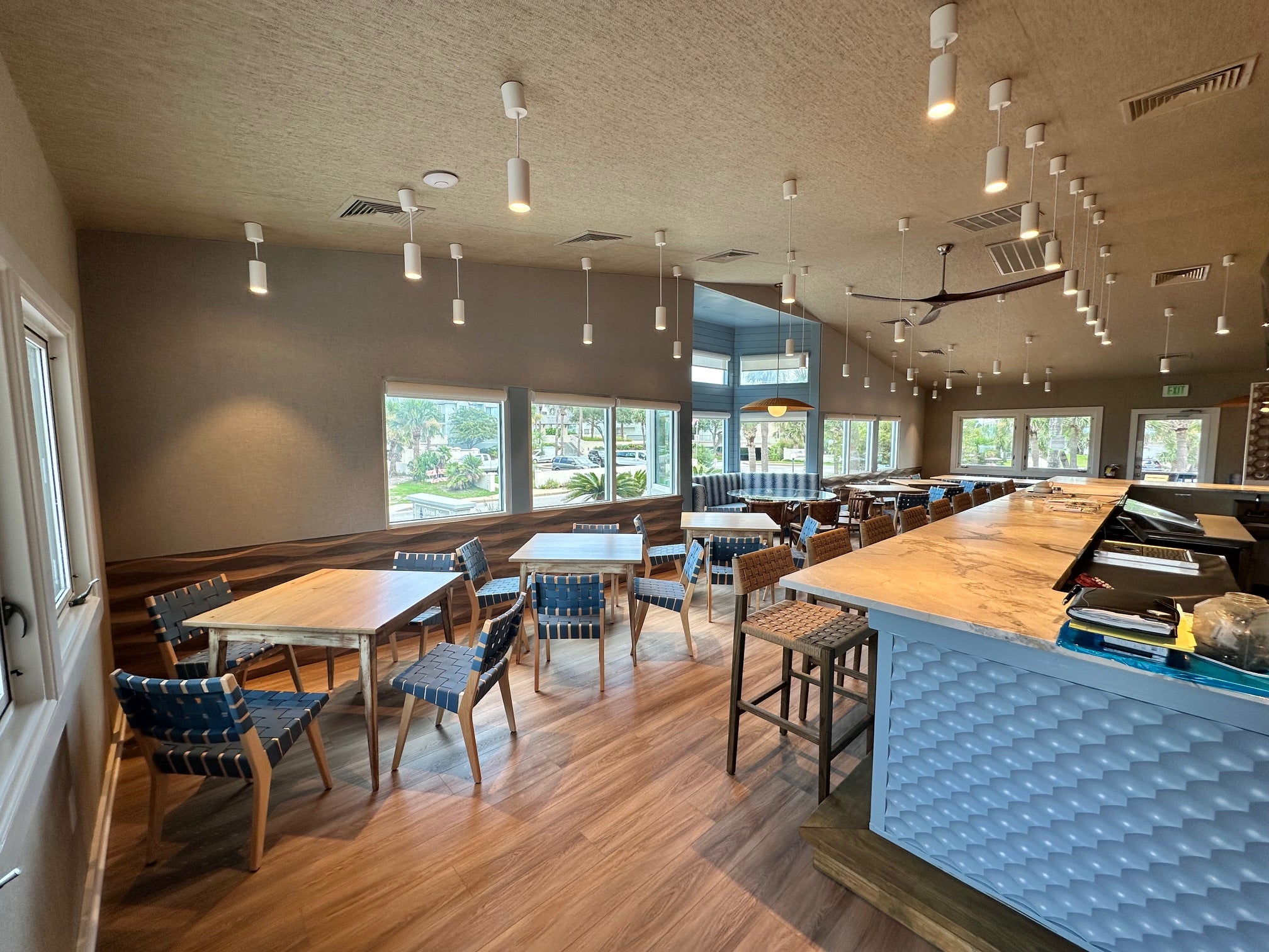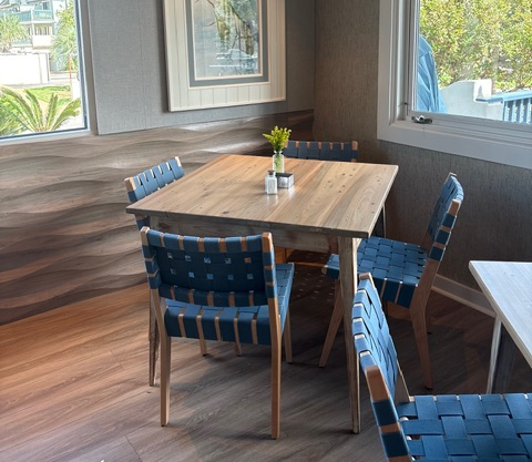 For this newly renovated dining room inside the Fripp Island Golf and Beach resort we created dining tables specifically for this coastal themed eatery. The square, round and rectangular tables are made local cypress and pine wood with a white wash for a beachy and coastal feel.