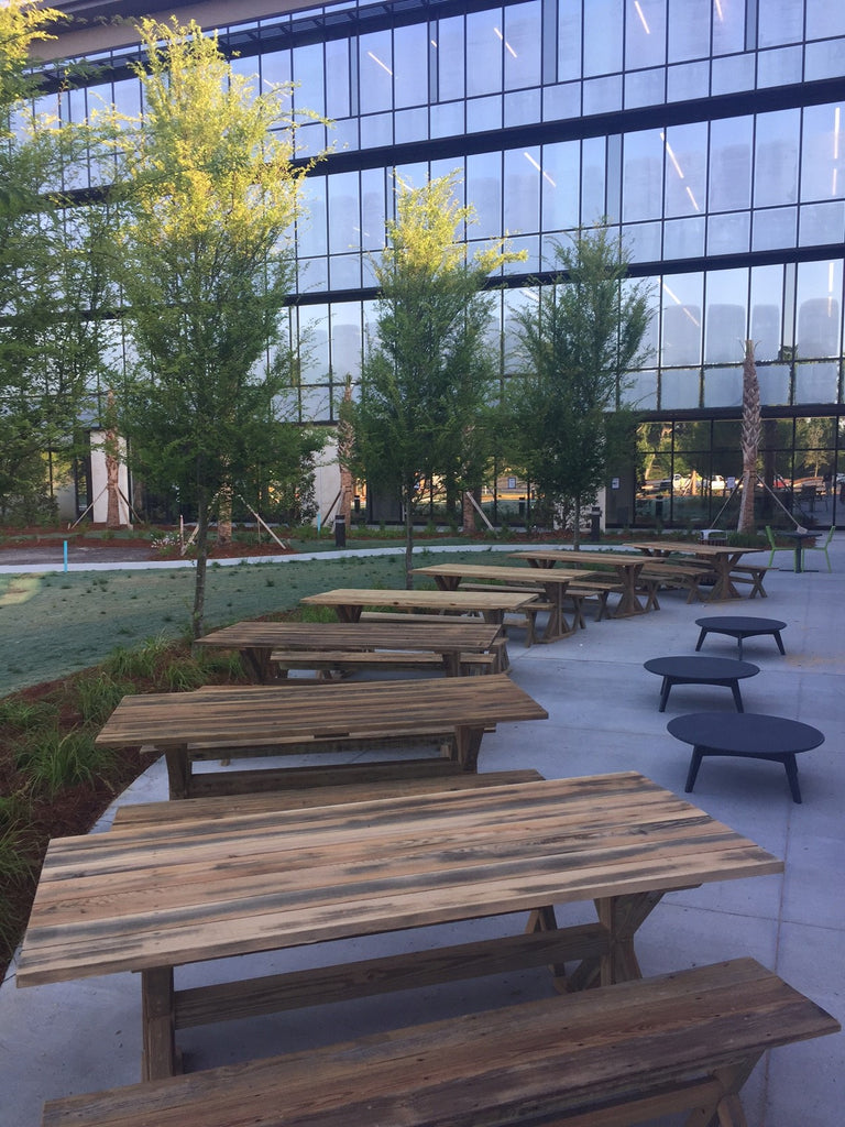 Out door commercial office space. Our tables were custom built to outfit this outdoor dining space on Daniel Island, SC. Reclaimed dockwood dining table and matching benches. Tall dining tables with dock wood tops and hand made iron bases were also custom designed for this space.