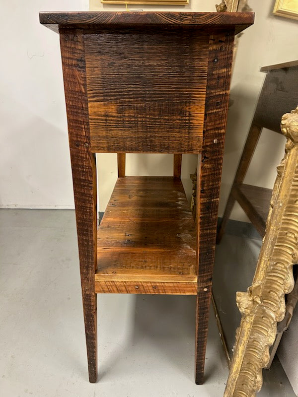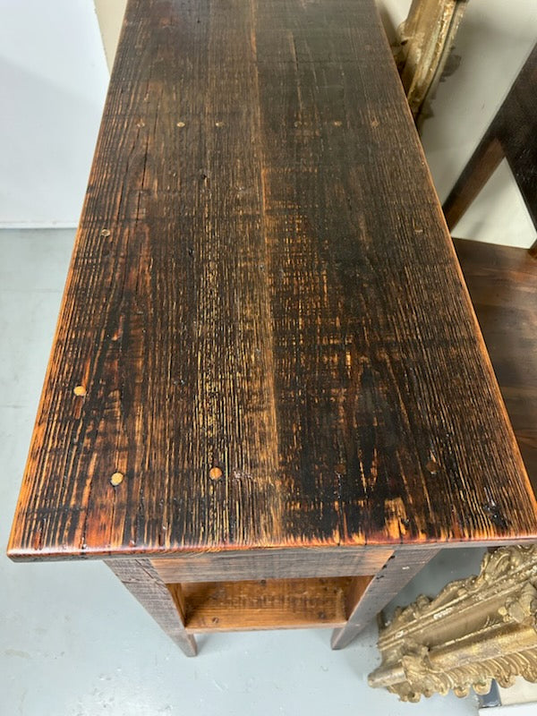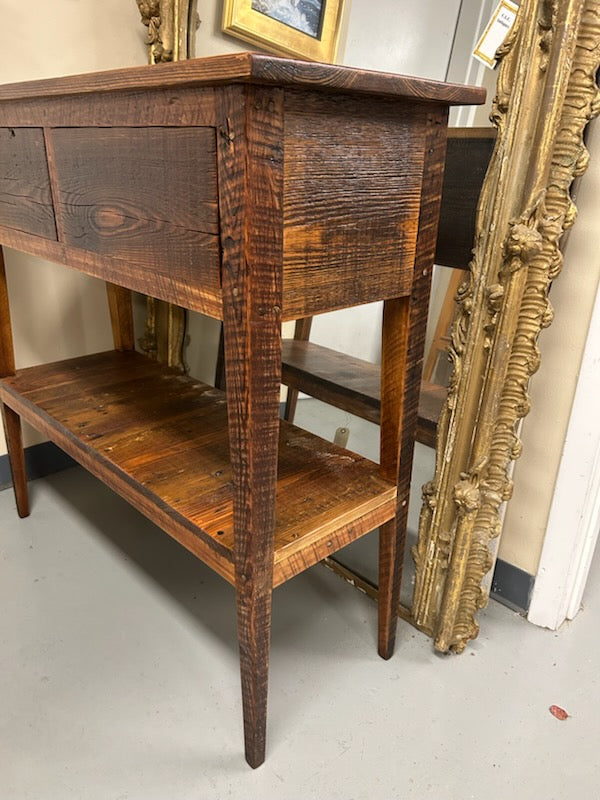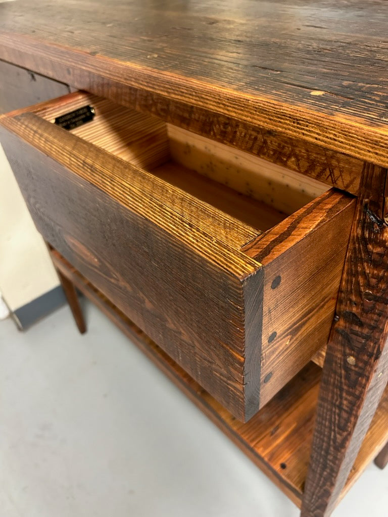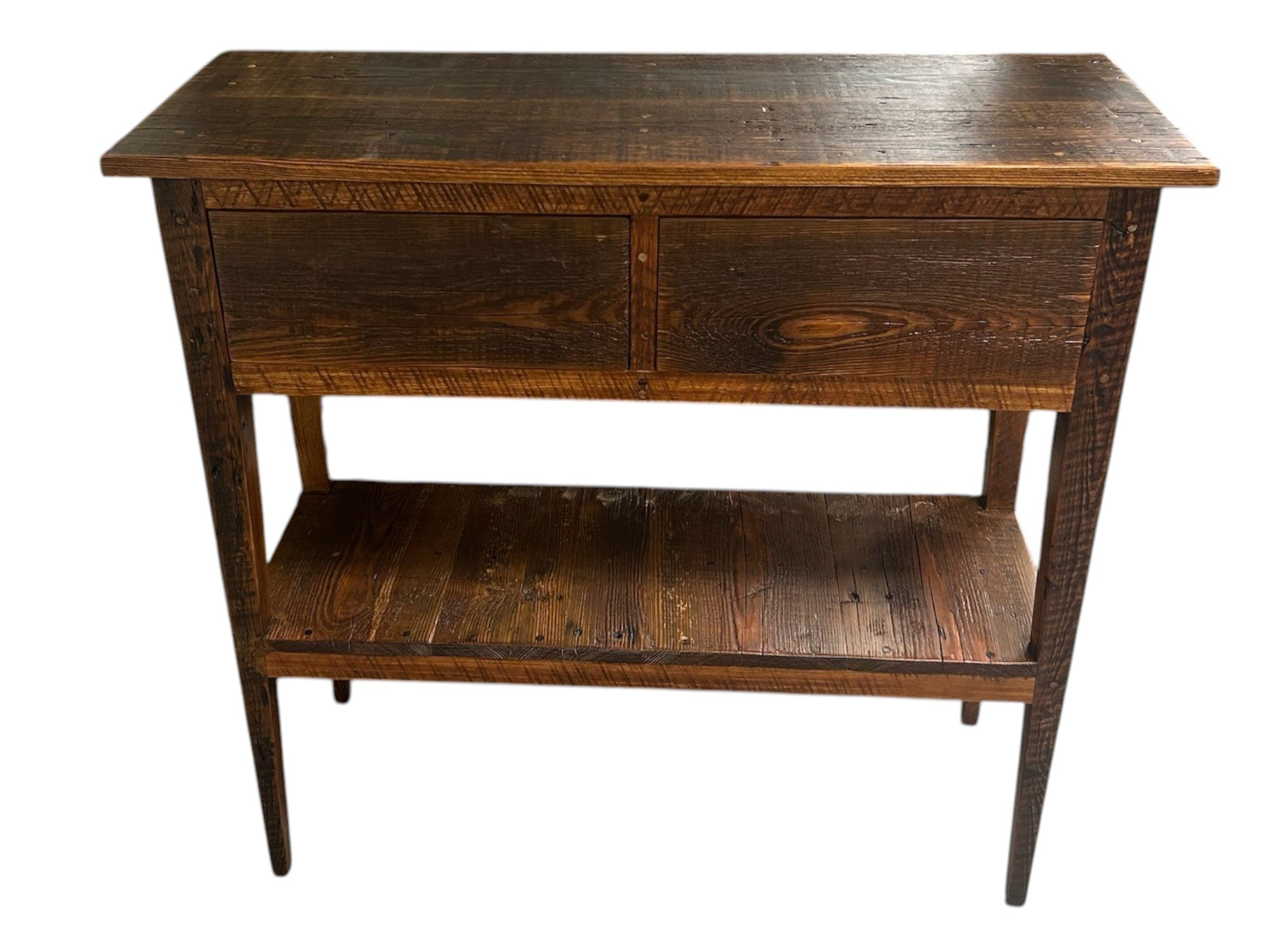 Two drawer sideboard made with local yellow and antique heart pine. Mid level shelf