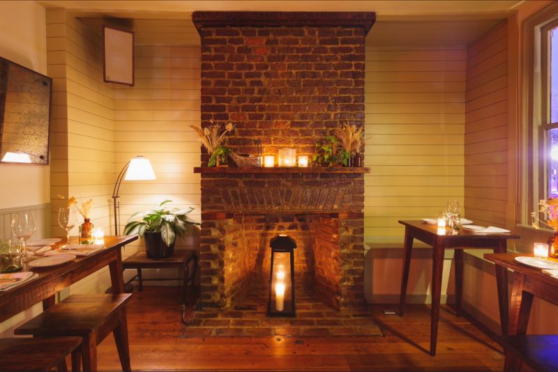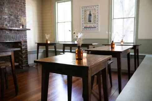 Newly opened in October of 2021, the new space was created into a wine bar. The owners restored the original fireplace in the 1891 building and filled the space with custom Landrum Tables and benches along with adding sage and cream walls to create a soft and inviting space.